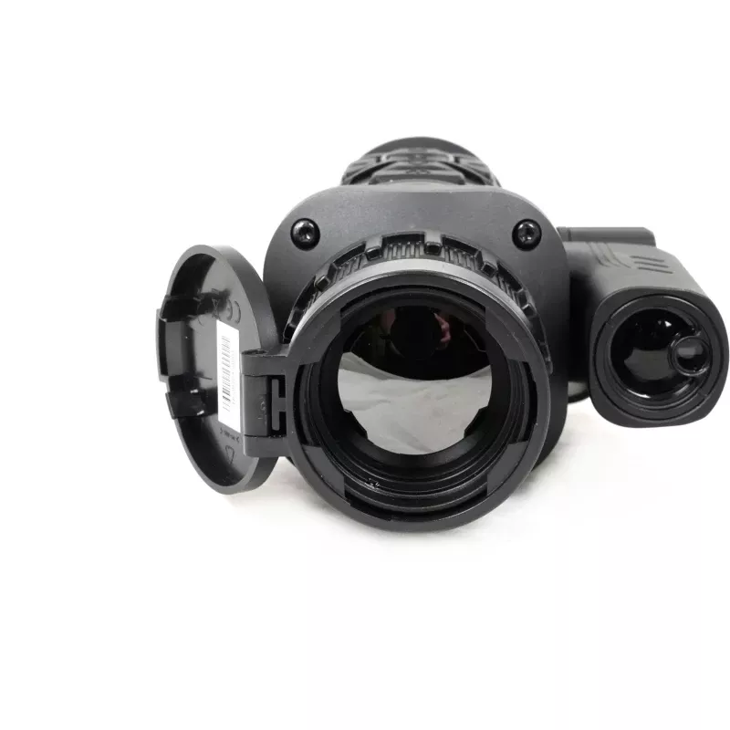 Тепловизионный прицел оснащен лазерным дальномером, способным оперативно измерять расстояния в диапазоне от 10 до 1200 метров. Излучатель и приемник находятся в одном оптическом канале, а само устройство удачно вписано в общий концепт конструкции и не мешает обзору. Дальномер работает на длинах волн 905 нм и отвечает требованиям первого класса лазерной безопасности. Погрешность измерений составляет ±1 м. Доступно 2 режима работы: одиночное измерение и режим непрерывного сканирования.