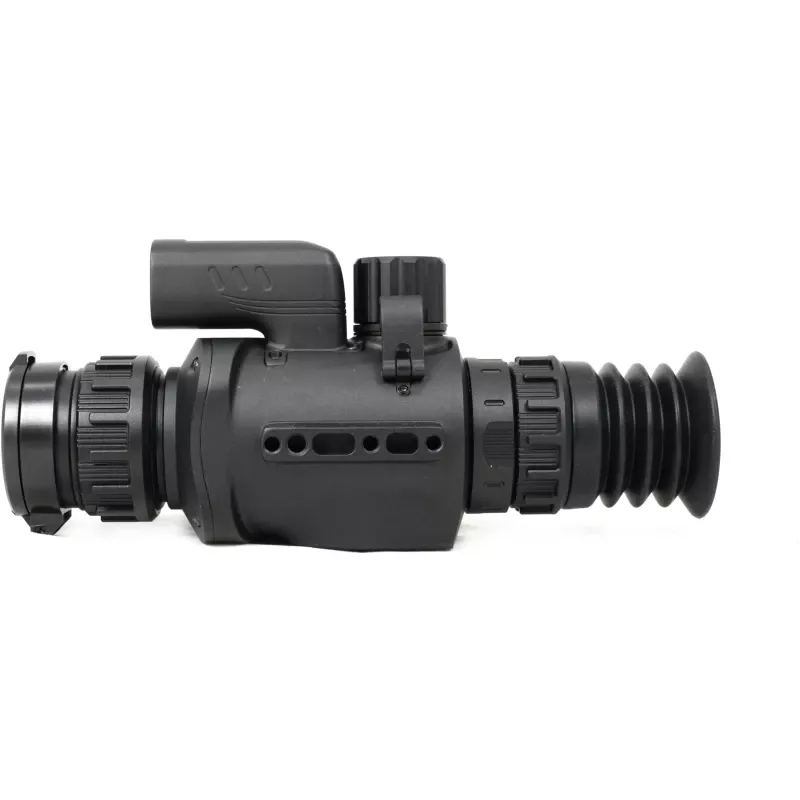 Германиевый объектив с фокусным расстоянием 35 мм и апертурой F1.0 обладает наибольшим во всей линейке прицелов показателем угла пространственного поля зрения FOV 12.5°x10°. В линейных размерах стрелок будет видеть перед собой сектор пространства размером 21,9 - 17,5 м на удалении в сто метров. Начальный уровень увеличения составляет 1,6х, для масштабирования изображения доступна функция Digital zoom, позволяющая плавно или дискретно изменять кратность в пределах от 1х до 8х. Наведение резкости изображения выполняется вручную, путем поворота низкопрофильного кольца на объективе.