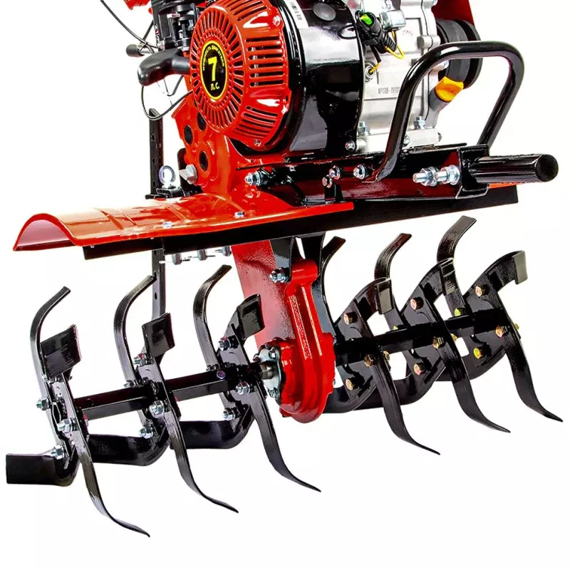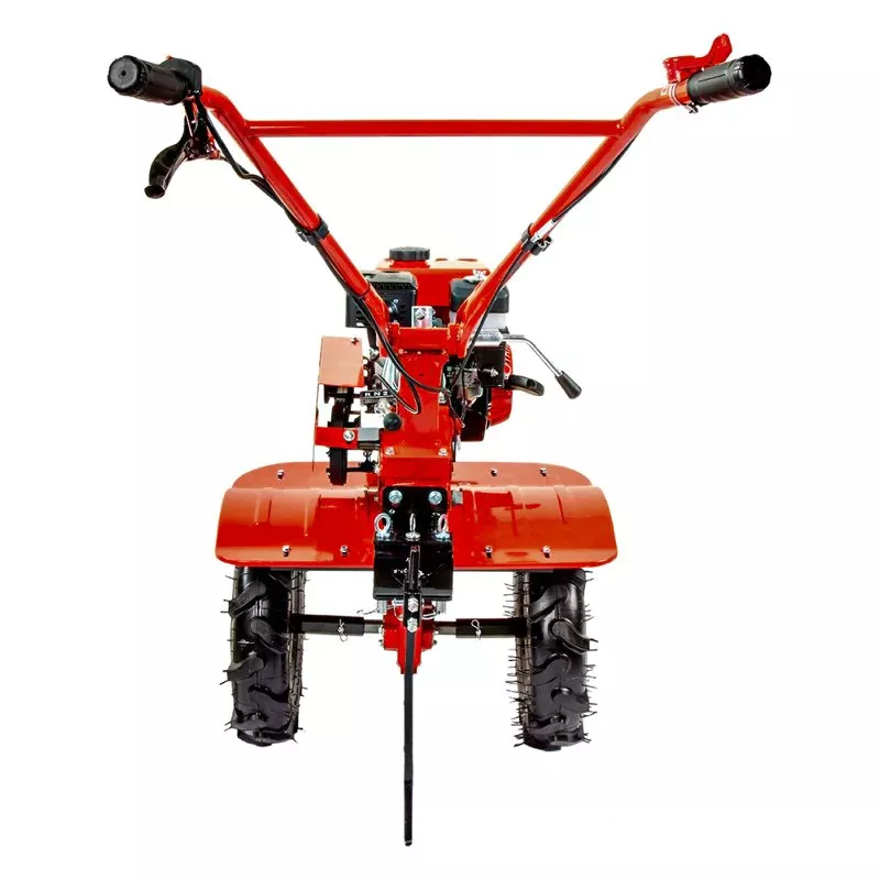 Бензиновый мотоблок оснащен сцепкой с тремя пальцами в комплекте. В передней части расположена сервисная рукоятка. Она нужна для удобной смены навесного оборудования. Мотоплуг обладает прочной конструкцией. Металлические шайбы изготовлены из металла и надежно защищают сальники редуктора от повреждений. Шкивы и трансмиссия с ременно-цепной передачей выполнены из чугуна.