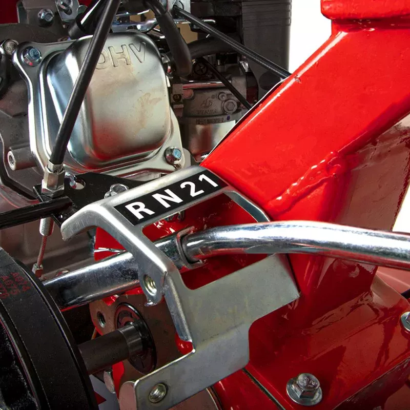 Над каждый колесом расположено широкое защитное крыло. Оно ограждает вас от комков грязи и частичек растительности. Руль регулируется в вертикальной и горизонтальной плоскостях. На его держателях есть накладки из нескользящего материала. Они обеспечивают надежный хват при управлении мотоблоком.
