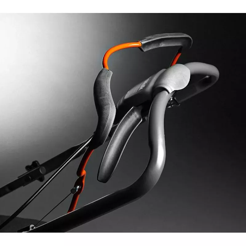 Ведущие колеса у модели задние, поэтому газонокосилка не буксует на мокром покрытии и при сильной загрузке контейнера для травы. Скорость регулируется в диапазонах от 3 до 4,5 км/ч. Медленный ход необходим для аккуратного лавирования между препятствиями и покоса объектов со сложным рельефом: деревьев, грядок, клумб. Высота рукояти настраивается по высоте в двух положениях, а также складывается, чтобы инструмент не занимал много места при хранении и транспортировке.