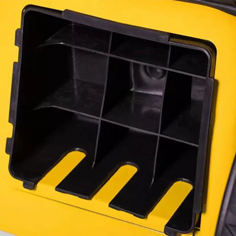 Высота покоса устанавливается с помощью 8-позиционной рукоятки по центру корпуса. Минимальное значение составляет 20 мм, максимальное – 80 мм. Все скошенные отходы поступают в травосборник, который вмещает до 70 л мусора, что позволяет обрабатывать территорию на протяжении долгого времени.