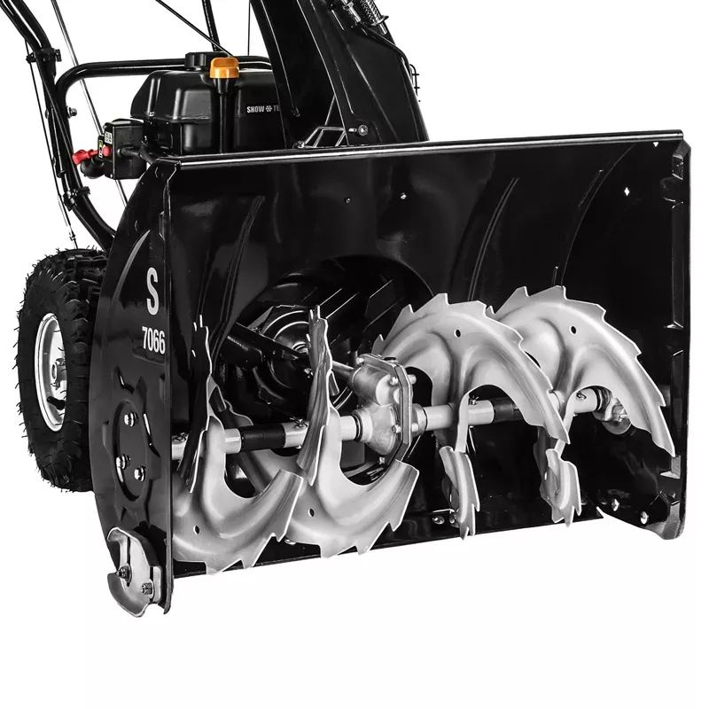 - Прочные шнеки с зубьями справляются как с плотными комками снега, так и грязи.