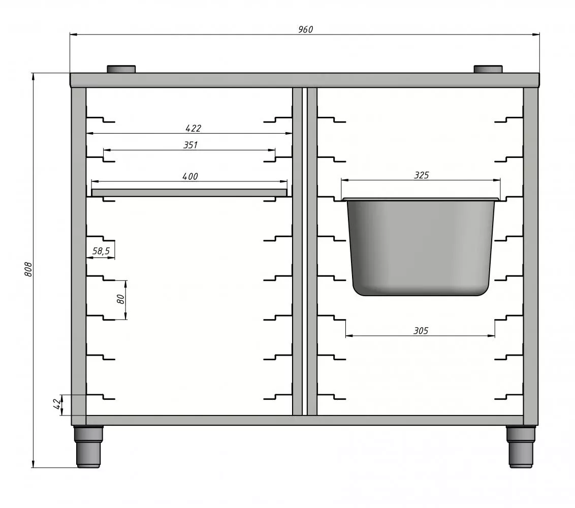 6 уровней под гастроемкости GN 1/1 325х530 мм или пекарский лист 600х400 мм