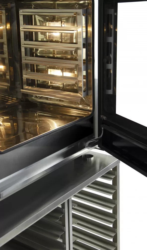 Корпус и камера пароконвектомата выполнены полностью из высококачественной нержавеющей стали, дверь - из двойного закаленного жаропрочного стекла.Внутренние стекло печи снабжено опцией легкого открытия для чистки.