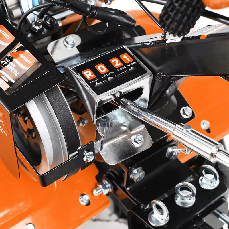 Мотоблок PATRIOT КАЛУГА М оснащен качественным, устойчивым к износу чугунным редуктором. Отсутствие швов позволяет избежать протечки масла. Специальный кожух защищает редуктор от попадания внутрь камней и грязи.