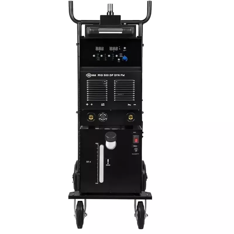 Полуавтомат ПРОФИ MIG 500 DP SYN FW поставляется с блоком водяного охлаждения объемом до 10 литров и с тележкой-платформой, для легкого и комфортного перемещения и эксплуатацию оборудования. Тележка оснащена надежной усиленной конструкцией. На нее можно установить сварочный источник, выносной подающий механизм, блок жидкостного охлаждения и газовый баллон объемом 40 литров.