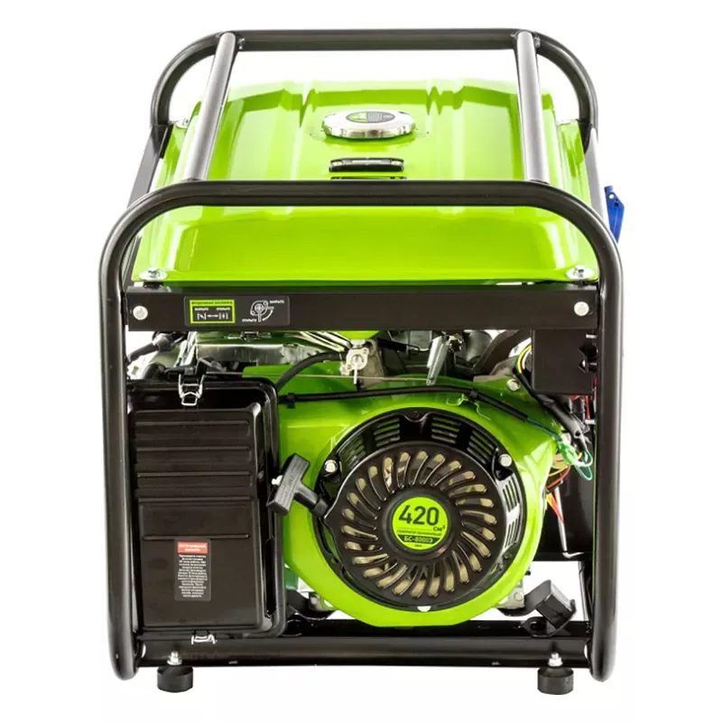Бензиновый генератор оснащен 4-тактным мотором объемом 420 см3 мощностью 15,1 л.с., вырабатывает однофазный переменный ток частотой 50 Гц. Электростартер максимально упрощает запуск двигателя. Аккумулятор для него входит в комплект поставки. После долгого простоя или в случае разрядки аккумулятора двигатель можно завести с помощью ручного стартера. За счет контроля напряжения электрогенератор подходит для питания компьютеров и другой чувствительной техники.