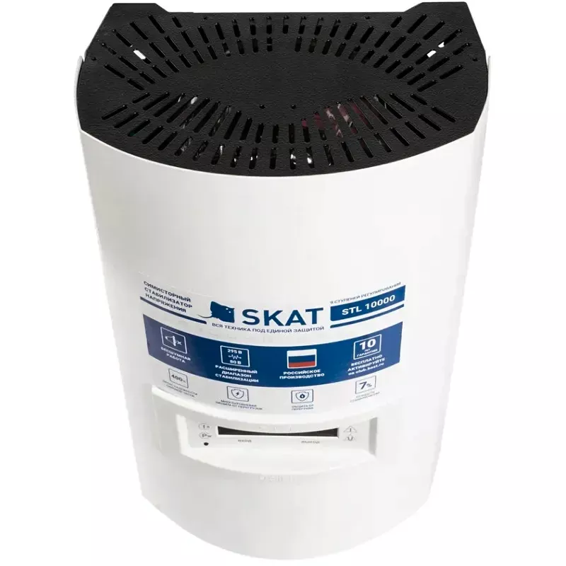 За счет конвективного воздушного охлаждения, без использования вентиляторов, однофазный стабилизатор напряжения SKAT STL 10000 H работает бесшумно. Несколько ступеней переключения и качественная элементная база обеспечивают плавность перехода и высокую точность стабилизации.