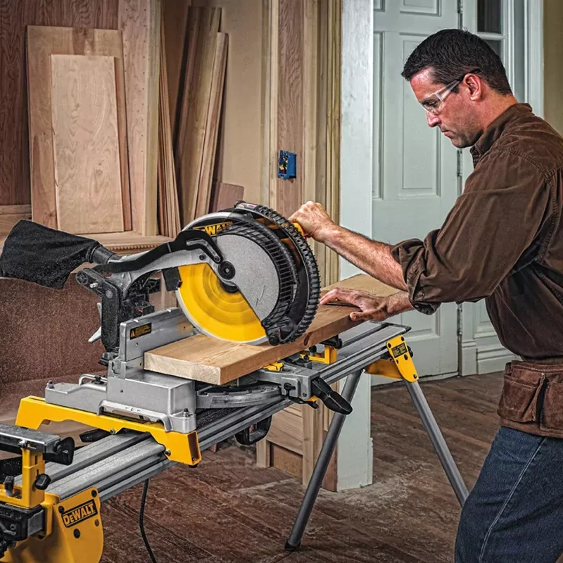 Торцовочная пила DeWalt DWS715 предназначена для обрезки досок, используется во время мебельных работ и при установке плинтусов. Благодаря режущему диску диаметром 305 мм устройство способно обрабатывать материал большого размера до 200 мм в ширину.