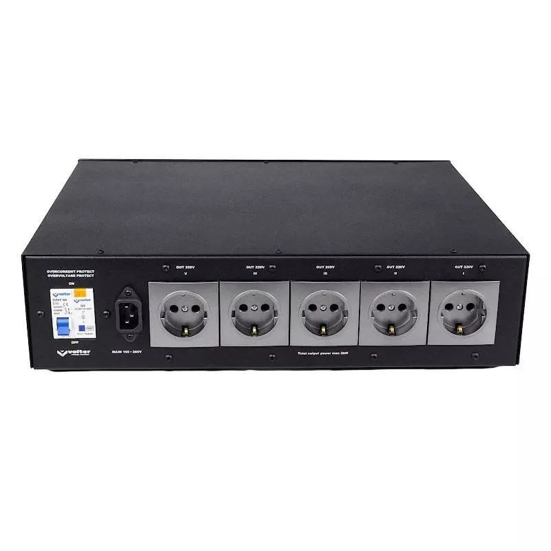 Для подключения однофазных потребителей на корпусе есть 5 розеток. В отличие от стандартных фильтров, которые нивелируют только импульсные скачки электросети, модель сглаживает частотные помехи от 0,001 до 30 МГц. Такой функционал полезен при работе с чувствительным звукозаписывающим оборудованием. А встроенный индуктивно-емкостный фильтр борется с синфазными и симметричными помехами.