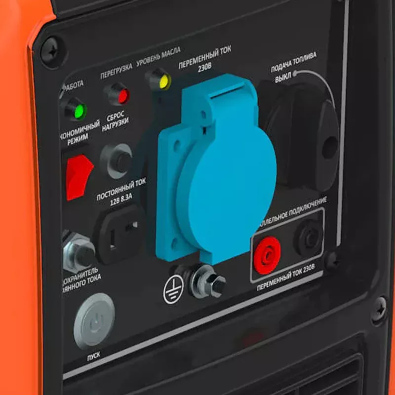 Благодаря электростартеру запуск инверторного генератора осуществляется поворотом рукоятки на корпусе или нажатием кнопки на пульте дистанционного управления. Потребителей можно подключить к розетке на 220 В переменного тока. Выход 12 В постоянного тока позволяет подзарядить автомобильный аккумулятор. Три цветных индикатора обеспечивают удобство эксплуатации и обслуживания устройства. Зеленый светодиод сигнализирует о работе в штатном режиме, красный — о перегрузке, желтый — о низком уровне масла. Для увеличения выходной мощности электростанции предусмотрены клеммы параллельного подключения еще одного такого же генератора.